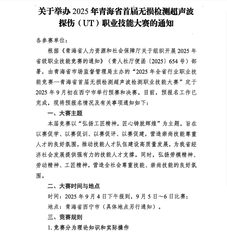 關(guān)于舉辦2025年青海省首屆無損檢測(cè)超聲波檢測(cè)探傷職業(yè)技能大賽的通知
